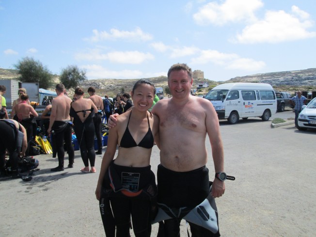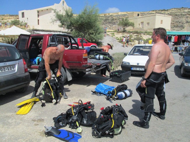 Tricky entry & exits – Boy, do I get more than I bargained for on this one! Being used to boat dives, where you literally drop out of the boat onto the dive site, getting in and out of the water in Gozo is one hell of an adjustment. All but one of our dives is done from the shore, which usually involves climbing over rocky cliffs and either sliding down or doing a 2-3m jump into the water – all with full gear on! This whole process is exponentially more exhausting than any of the dives themselves. A unique aspect of Gozo diving that definitely keeps one in good shape!
